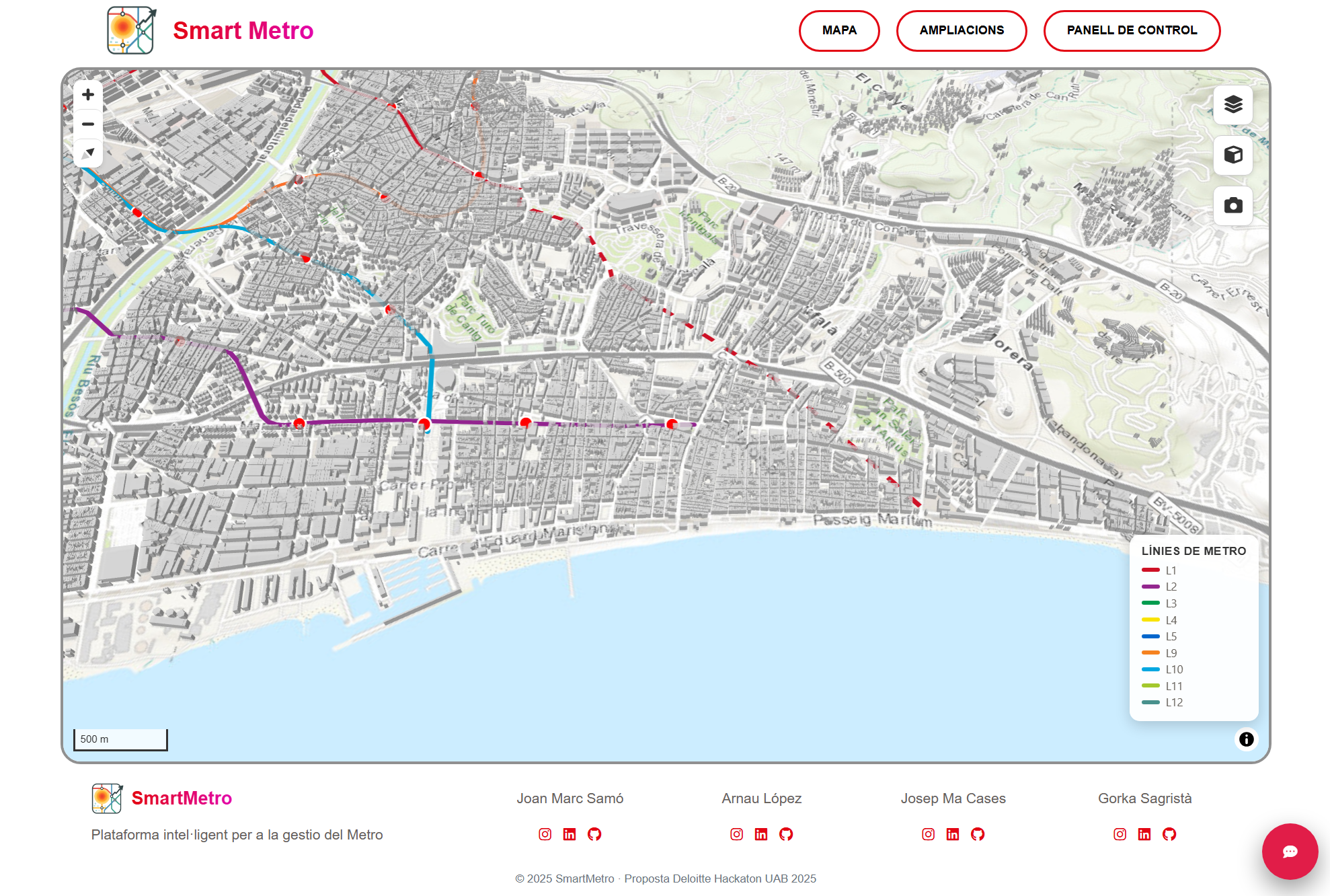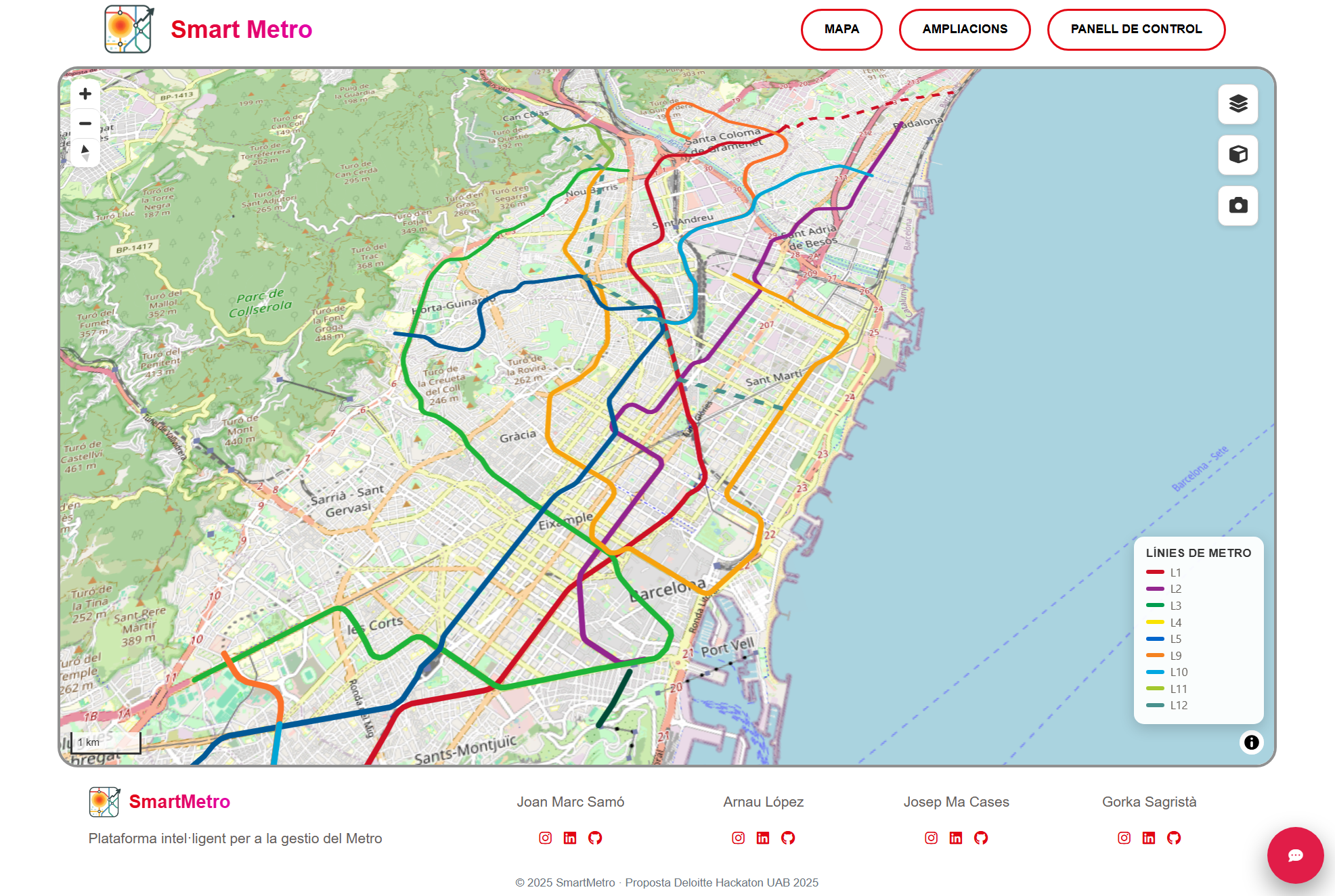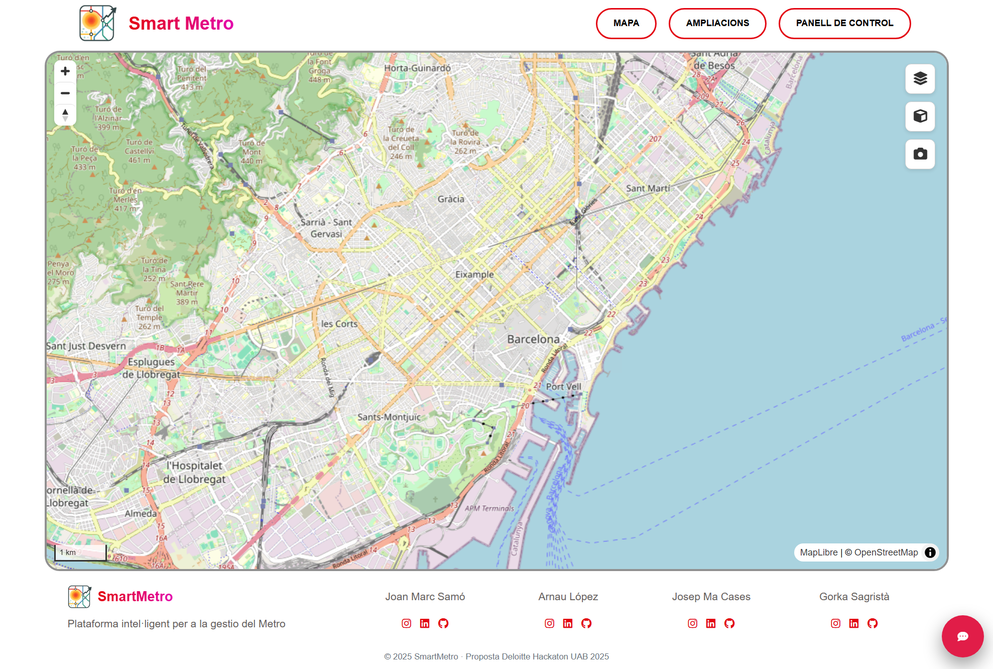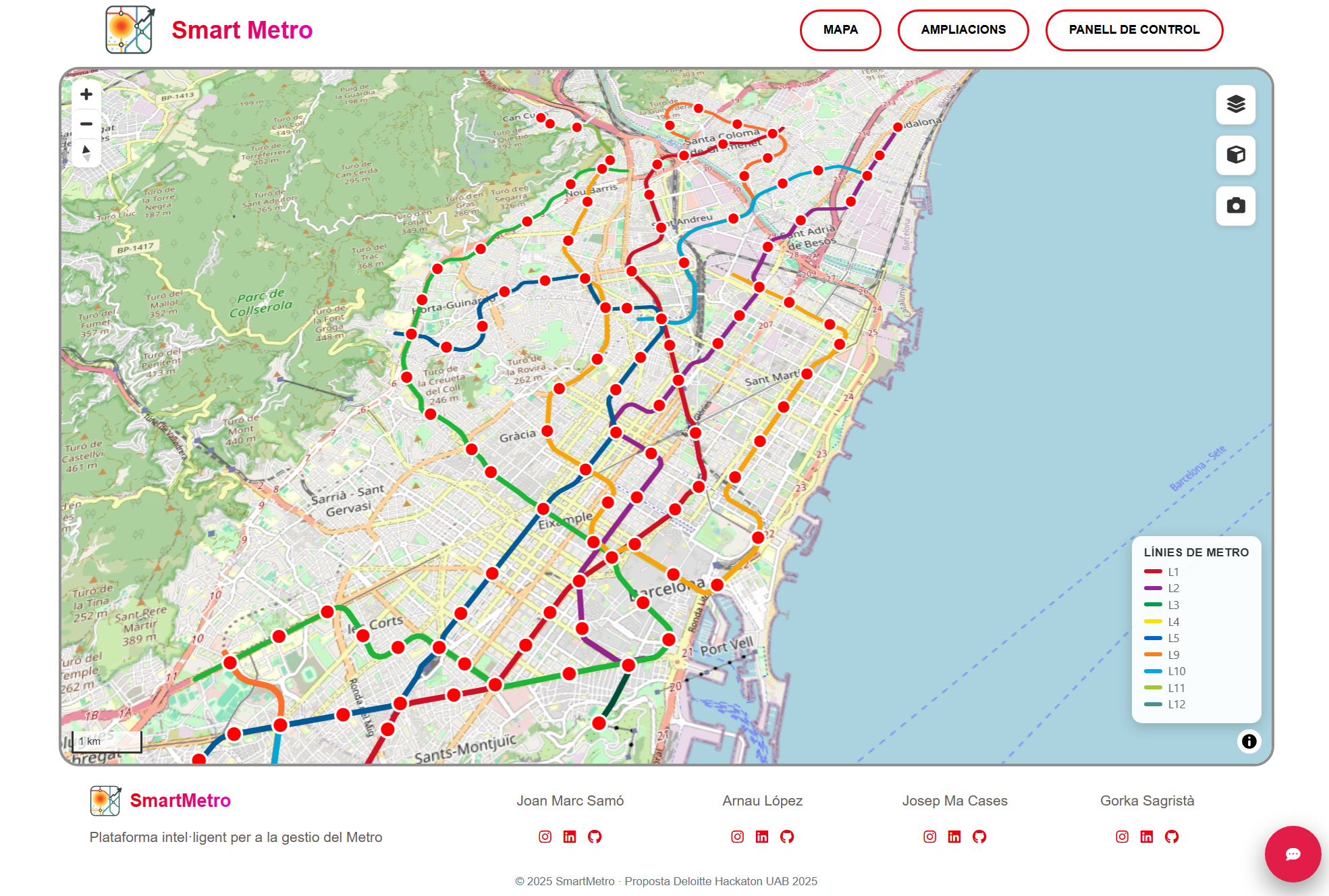 SmartMetro es la proposta desenvolupada a la Hackathon UAB 2025 per estudiar patrons de demanda al transport public de Barcelona, visualitzar-los sobre mapa i definir noves ampliacions amb impacte real en la congestio.