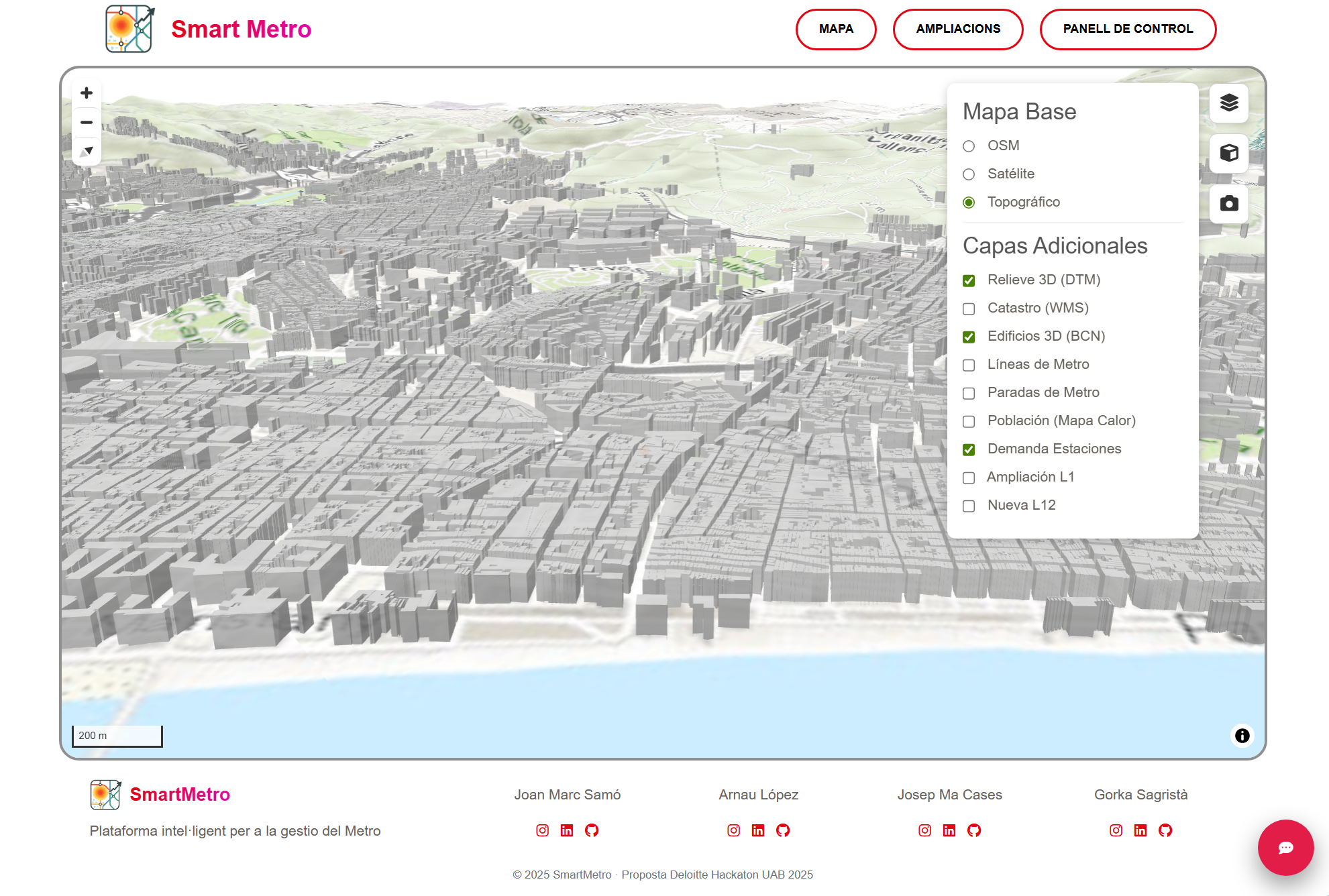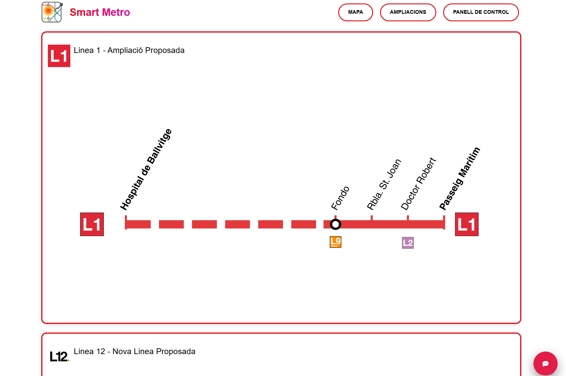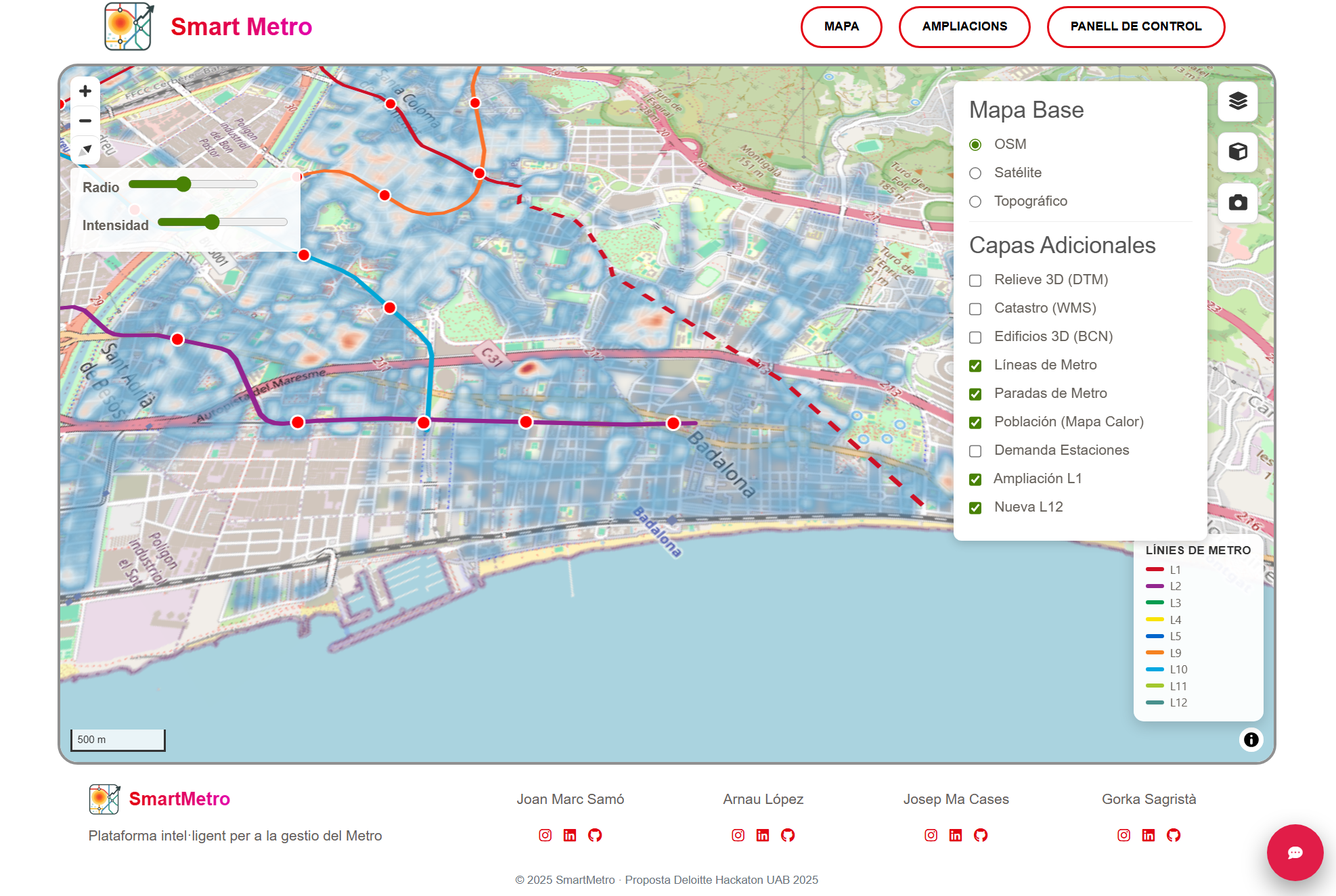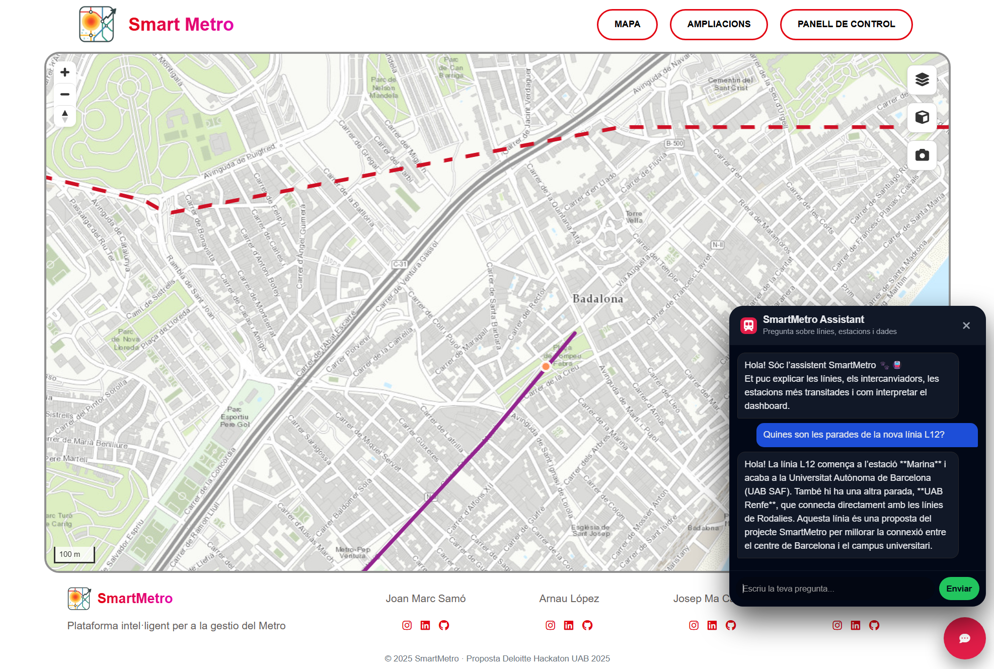 SmartMetro es la proposta desenvolupada a la Hackathon UAB 2025 per estudiar patrons de demanda al transport public de Barcelona, visualitzar-los sobre mapa i definir noves ampliacions amb impacte real en la congestio.